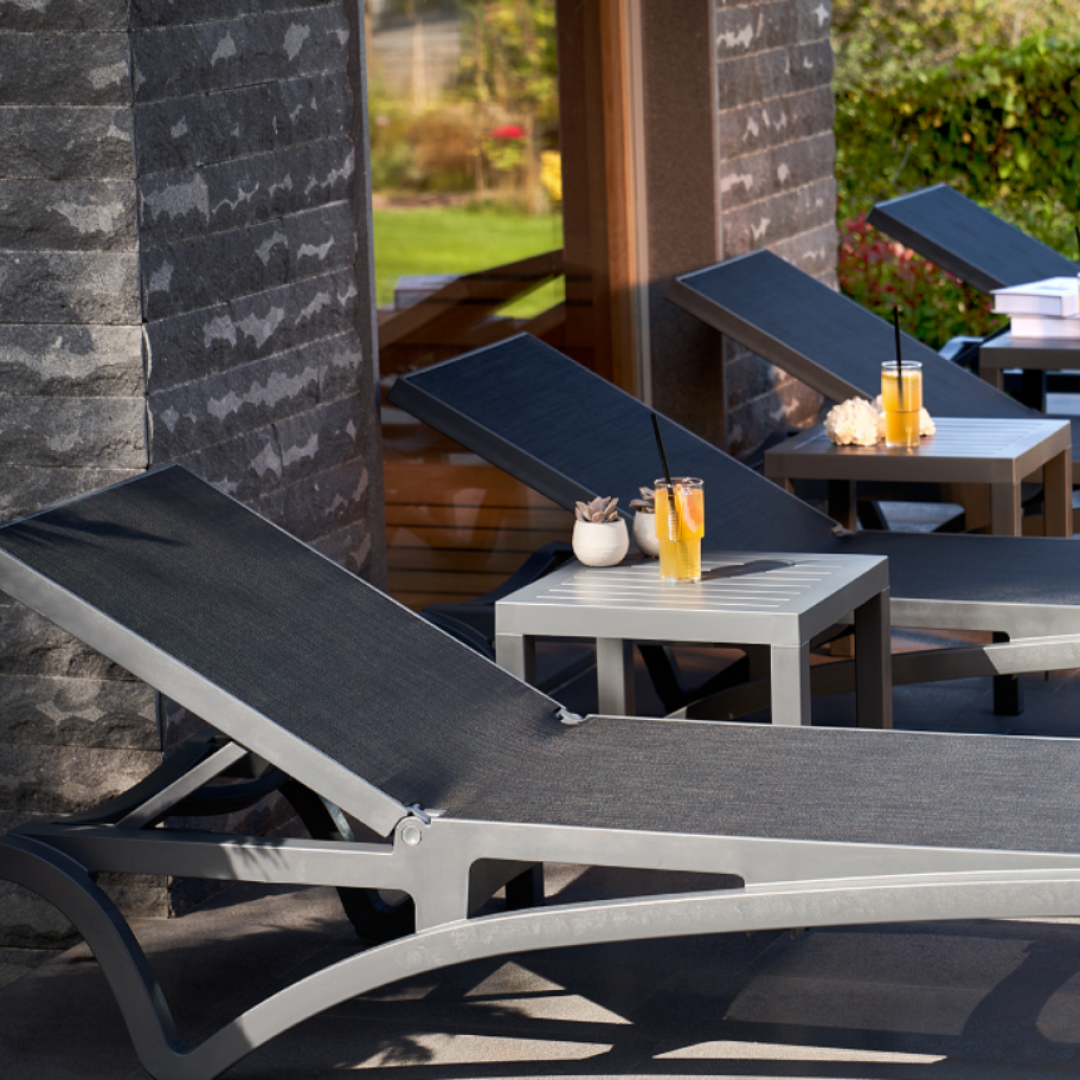 Pohodlné lehátko s odolnou tkaninou je vyrobeno z povětrnostně odolné pryskyřice chráněné proti UV záření vyztužené skleněným vláknem, které odolá letním přeháňkám a silnému slunci, díky čemuž je ideálním bezstarostným doplňkem venkovního posezení. Lehátka jsou stohovatelné.